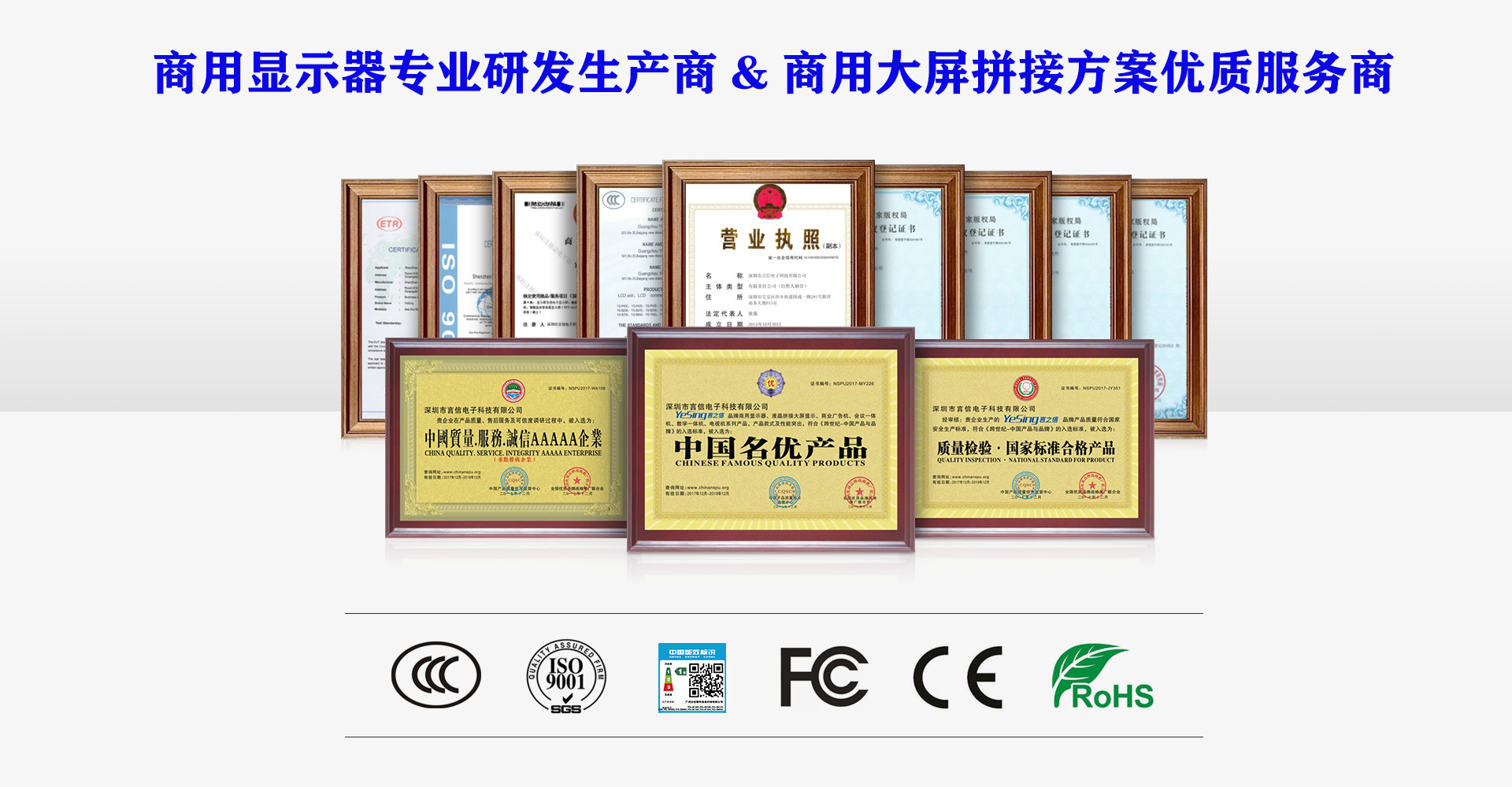 深圳言信電子科技有限公司是一家專業數字商用顯示設備集研發,生產,銷售和服務為一體的產品供應和顯示方案定制解決的科技企業。公司于2015年在成立深圳市言信電子科技有限公司,旗下擁有多家業務子公司。公司自成立以來一直恪守“誠信鑄就品質,創新引領未來”的經營理念,秉承“誠信、實惠、原創、信賴”的承諾,立足產業發展,放眼全球行業布局,以“共贏、共享”的經營方式,幫助客戶提升其行業競爭力。言信公司推出的“YeSing言之信”品牌商業顯示設備系列產品。攜手全球知名的LCD廠商致力打造高端,高性價比和優良的服務體驗的商業顯示設備和顯示工程方案供應商。核心系列產品主要包括:液晶拼接顯示屏、小間距高亮LED顯示屏、液晶監視器、室內外數字多媒體廣告機、觸控查詢一體機、教學和會議交互式一體機、透明液晶顯示柜和OLED多媒體設備等產品。產品通過和取得了3C、CE、FCC、RoSH、能效和ISO9001證書和測試報告,并獲得中國質量、服務、誠信5A級企業,質量檢驗、國家標準合格產品,中國名優產品等稱號。言信產品主要應用在政府機關、電力、能源、石油化工、軍隊、人防、公檢法、交通、通信等各企事業單位,也可以適用酒吧、酒店、KTV 、 商超,滿足客戶安防監控調度、應急指揮、展覽展示、教育培訓、會議等各行業顯示和宣傳需求。